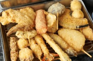 シーロムで串カツを楽しむならここ!野菜、肉、海鮮など35種類以上の串が揃い、一本一本丁寧に揚げたサクサク食感が魅力です。外観・店内ともに日本の昭和レトロな雰囲気で、どこか懐かしさを感じられる空間。ランチは新鮮な魚を中心にした定食が人気で、味・ボリュームともに大満足。魚が食べたくなったら自然と足が向く、地元でも評判の一軒です。